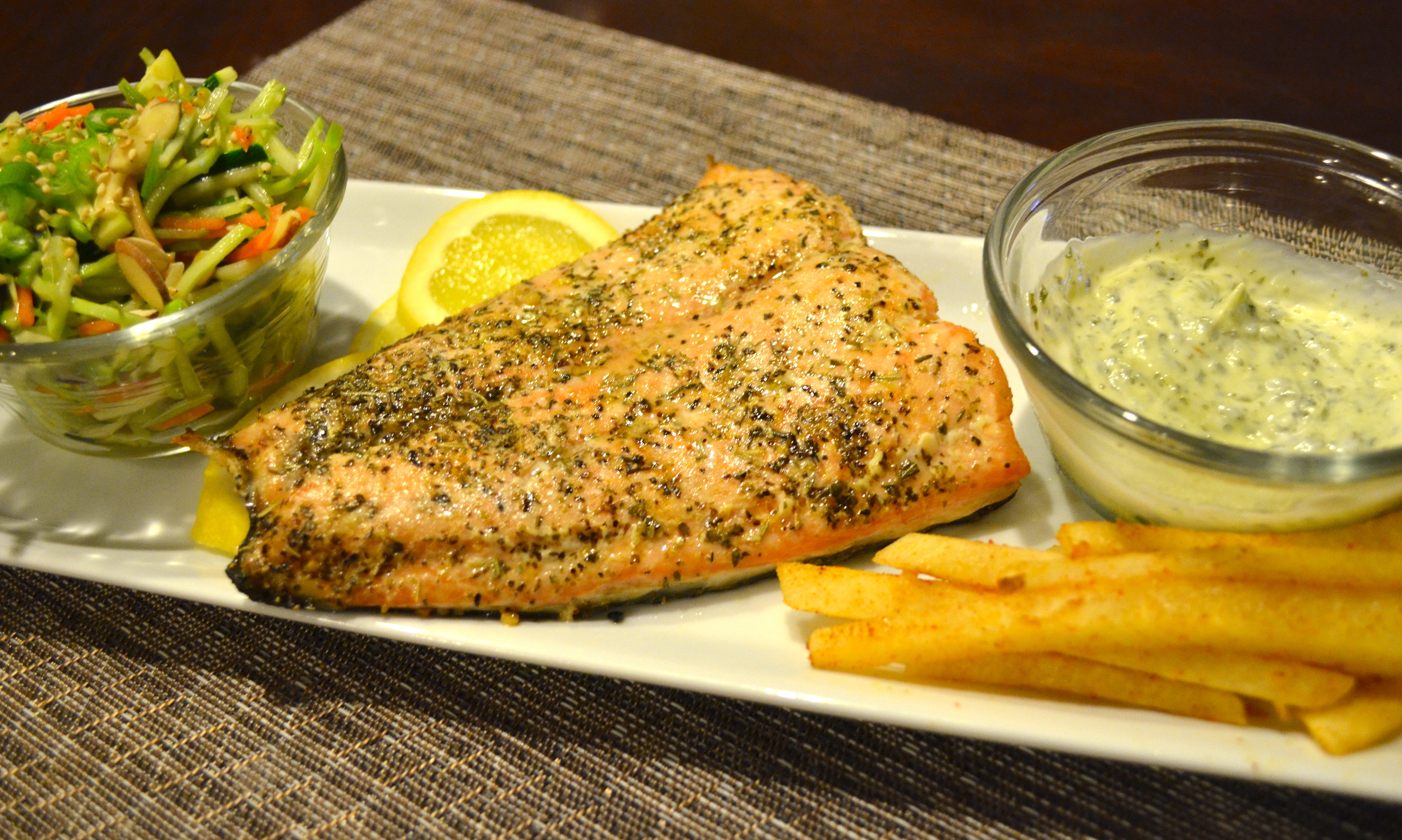 Italian Seasoned Salmon with Thai Coleslaw & Mayo Pesto